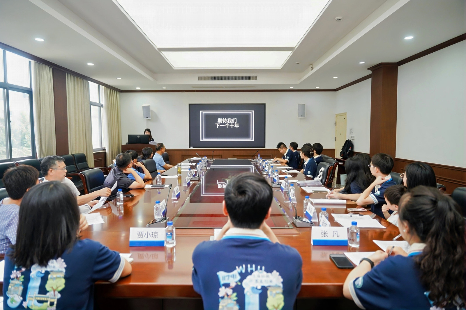 活动开场前,会议室播放着《合照》《武大版南山南》等校园歌曲,大屏幕放映出十几年前的老照片和视频。 一场特别的“点名报到”仪式拉开了活动的序幕。主持人念出一个个熟悉的名字,同学们纷纷大声应答“到”,这份跨越十年的约定,让每个人都感受到了集体的温暖和力量。