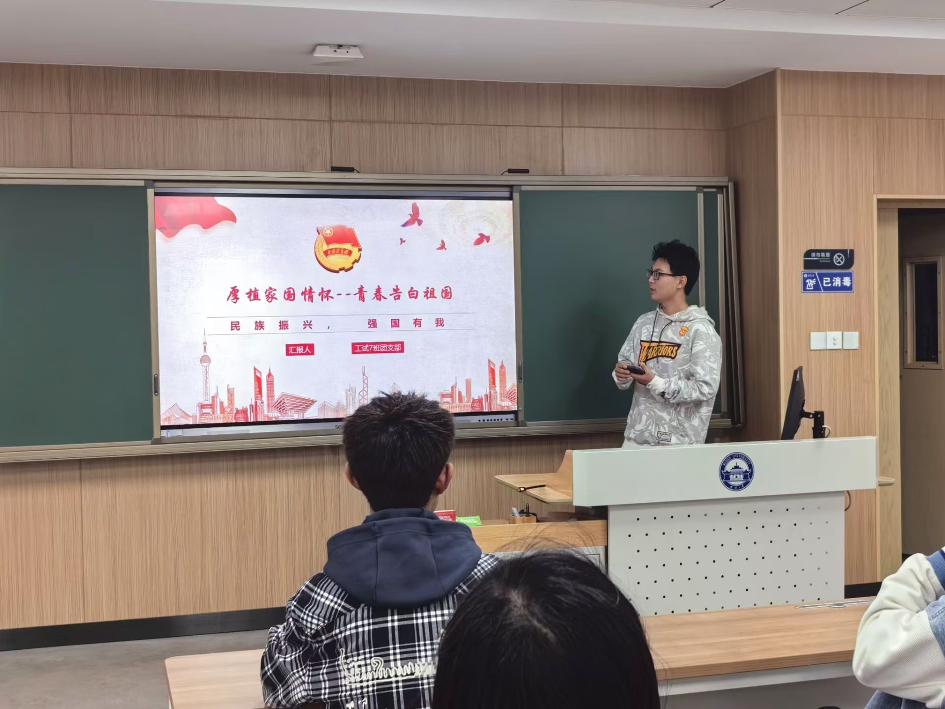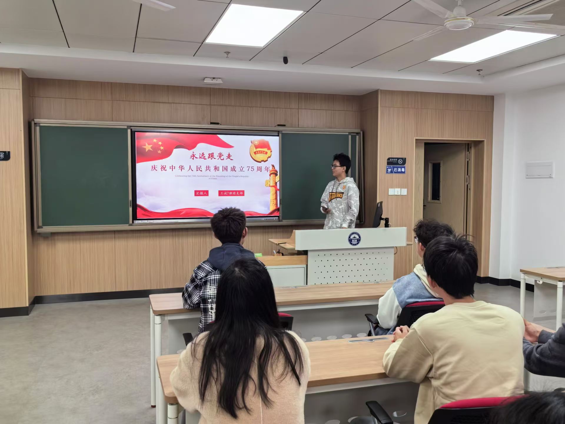 然后赵家晟同学进行第二部分“庆祝中华人民共和国成立75周年”主题讲解。会议中,赵家晟同学以新中国的发展历史为线,详细展示了75年来中国人民在中国共产党坚强领导下,团结拼搏,艰苦奋斗,实现了国家从积贫积弱到繁荣富强的伟大转变,着重强调了中国共产党在中华人民共和国的建设过程中所发挥的中流砥柱作用,教育全体团员中国共产党领导是中国特色社会主义制度的最大优势,并在同时指出当代青年应当弘扬团结拼搏,艰苦奋斗的优良传统,在全面建成社会主义现代化强国的拼搏路上再创辉煌。