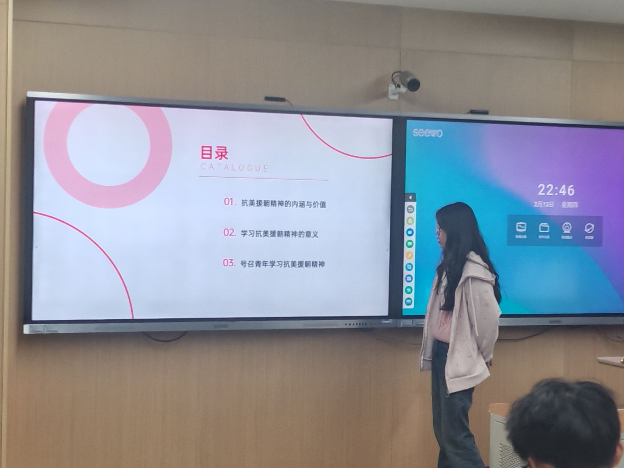 随后,由组织委员黄悦围绕抗美援朝精神展开深入讲解。通过PPT展示,团员青年们了解到了抗美援朝精神的内涵与价值。在极端恶劣的环境下,志愿军战士展现出的革命英雄主义精神令人动容。他们以顽强的毅力与敌人展开殊死搏斗,这种精神不仅体现在战场上的英勇无畏,更体现在对革命事业坚定不移的信念和无私奉献上。这激励着团员青年们在面对困难和挑战时,要勇于担当、敢于拼搏。同时,志愿军战士在艰苦战争环境中始终保持积极乐观的态度,用歌声和信念驱散战争的阴霾,这种革命乐观主义精神,让团员青年们认识到在生活和学习中,要保持积极向上的心态,增强心理韧性,在困境中寻找机遇。