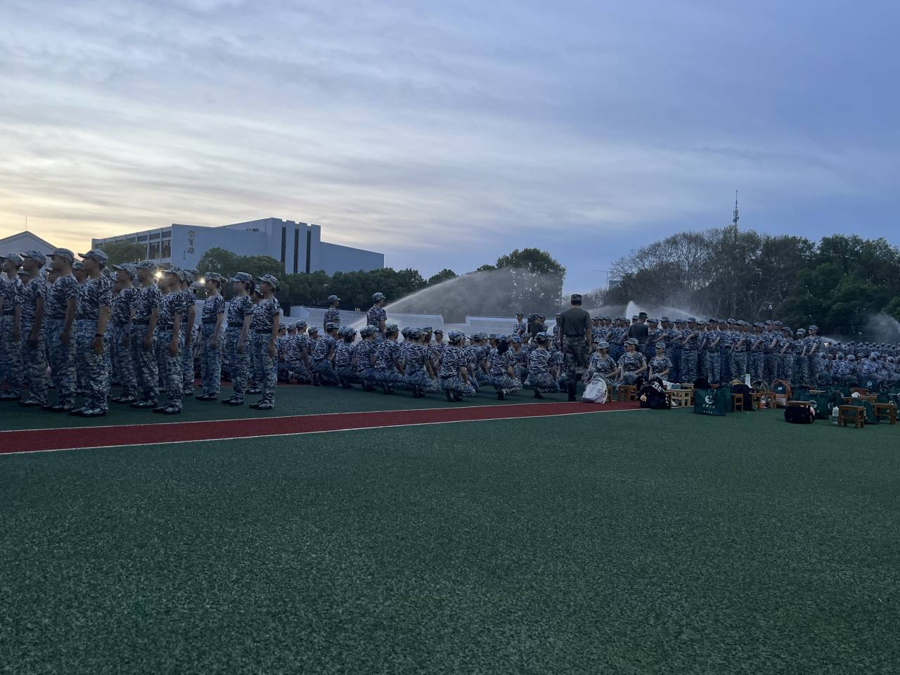 路边微黄的路灯照映着珞珈山的夏夜,山下的学子正在绿茵上放声高喊,展现军人应有的雄姿英发。晚风拂过,军歌起落,高昂混雄的歌声飘扬在充斥着盛夏的余热的天空中。铁骨铮铮,热血腾腾,站军姿时的汗水浸透了每个人的衣衫,挂在衣领上的汗水反射灯光,照在彼此脸上,我们嘴角微扬,那是武大的少年郎不畏考验的标志。