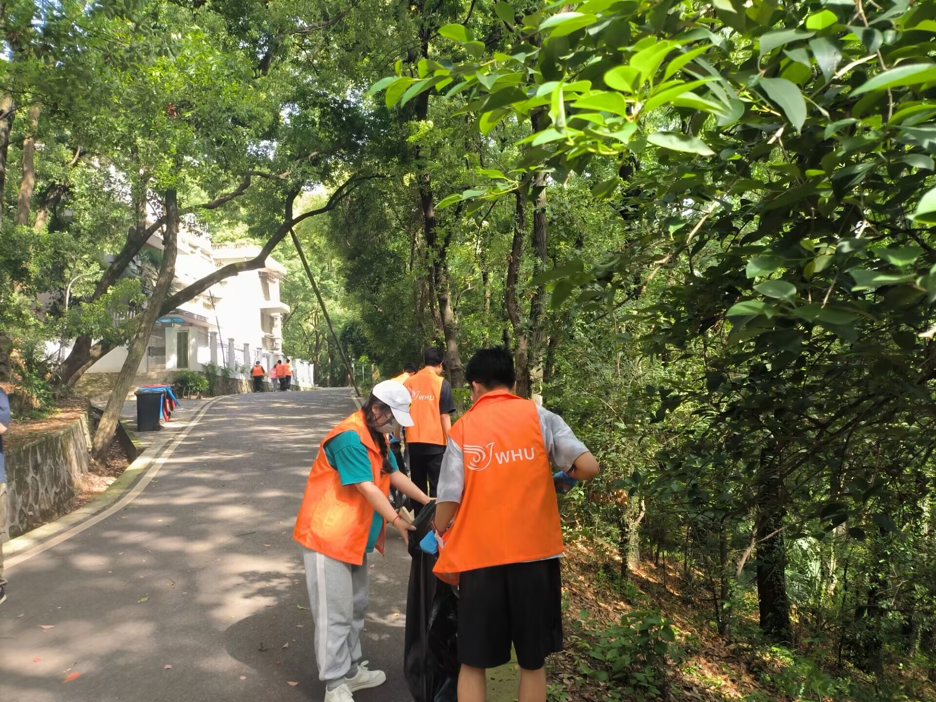 沿着环山北路,灌木郁郁葱葱,志愿者们细细清理零星散落着的矿泉水瓶,塑料袋、纸巾等垃圾。大家各司其职,有人负责用垃圾夹拾取挂在灌木高处的塑料袋;有人负责用垃圾袋收集处理;有人用手套拾取灌木丛中的矿泉水瓶……组内成员协调合作,小组之间互帮互助,一路上其乐融融。山林间一个个忙碌的橘色身影,成了最靓丽的风景线。活动中,大家近距离地与山林灌木接触,充分领略了珞珈山的美丽风光,增强了身为“珞珈学子”的认同感。阳光热烈,山路遥遥,但大家依旧干劲十足,不放过目之所及的任何垃圾,团结互助,用行动诠释了“奉献、友爱、互助、进步”的志愿者精神。