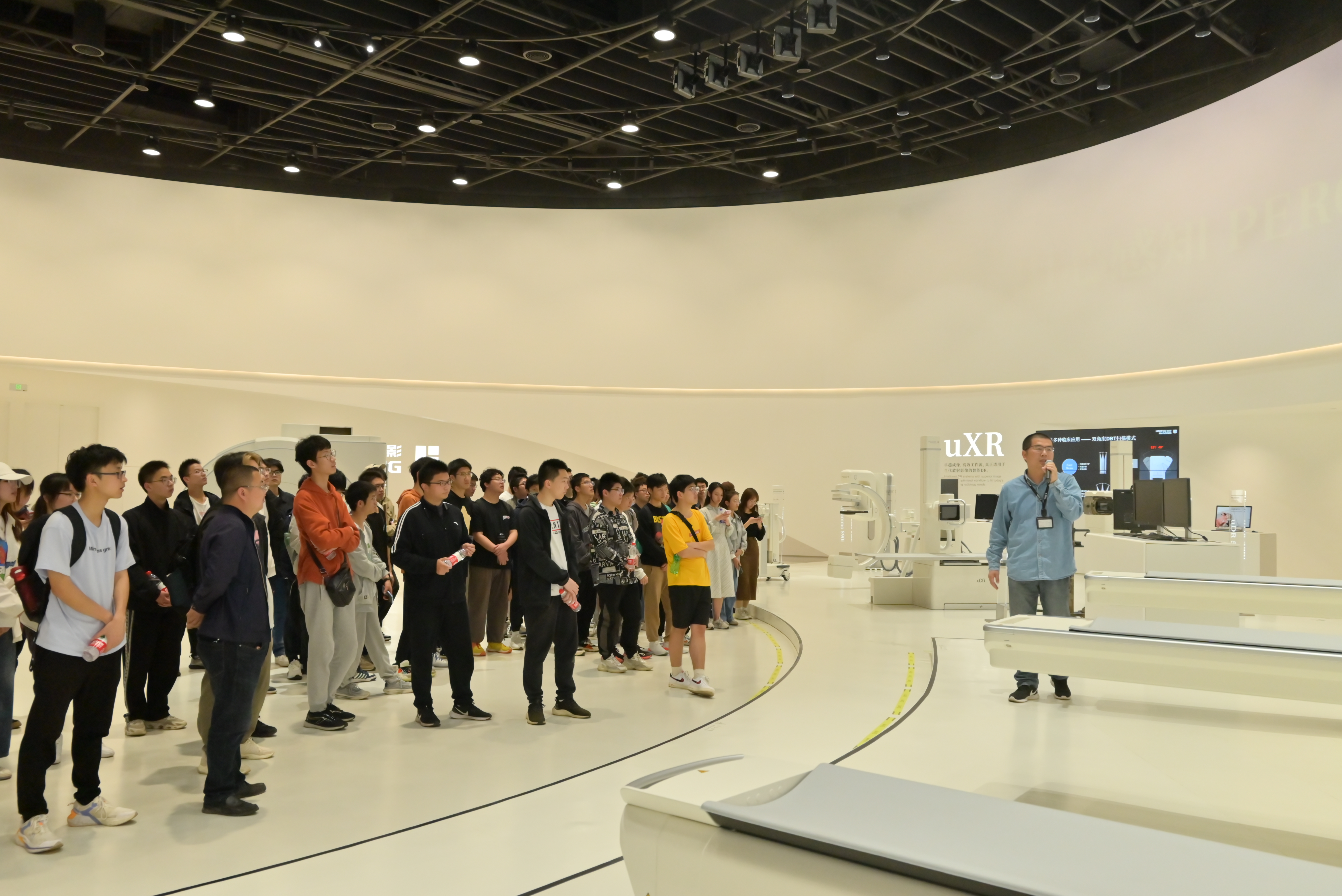 同学们到达联影公司后,参观了展厅里的全国首款高场动物磁共振uMR Jupiter、行业首款75cm超大孔径3.0T磁共振uMR Omega、国产首款“时空一体”超清TOF PET/MR、行业首款一体化CT直线加速器等众多价值千万甚至上亿的高端精密仪器。随后,大家参观了魔方复合手术室,了解了“奇迹之心”柔性心电记录仪。先进的仪器与技术极大地拓宽了大家的视野,激发了同学们对于科技研究的热情和向往。