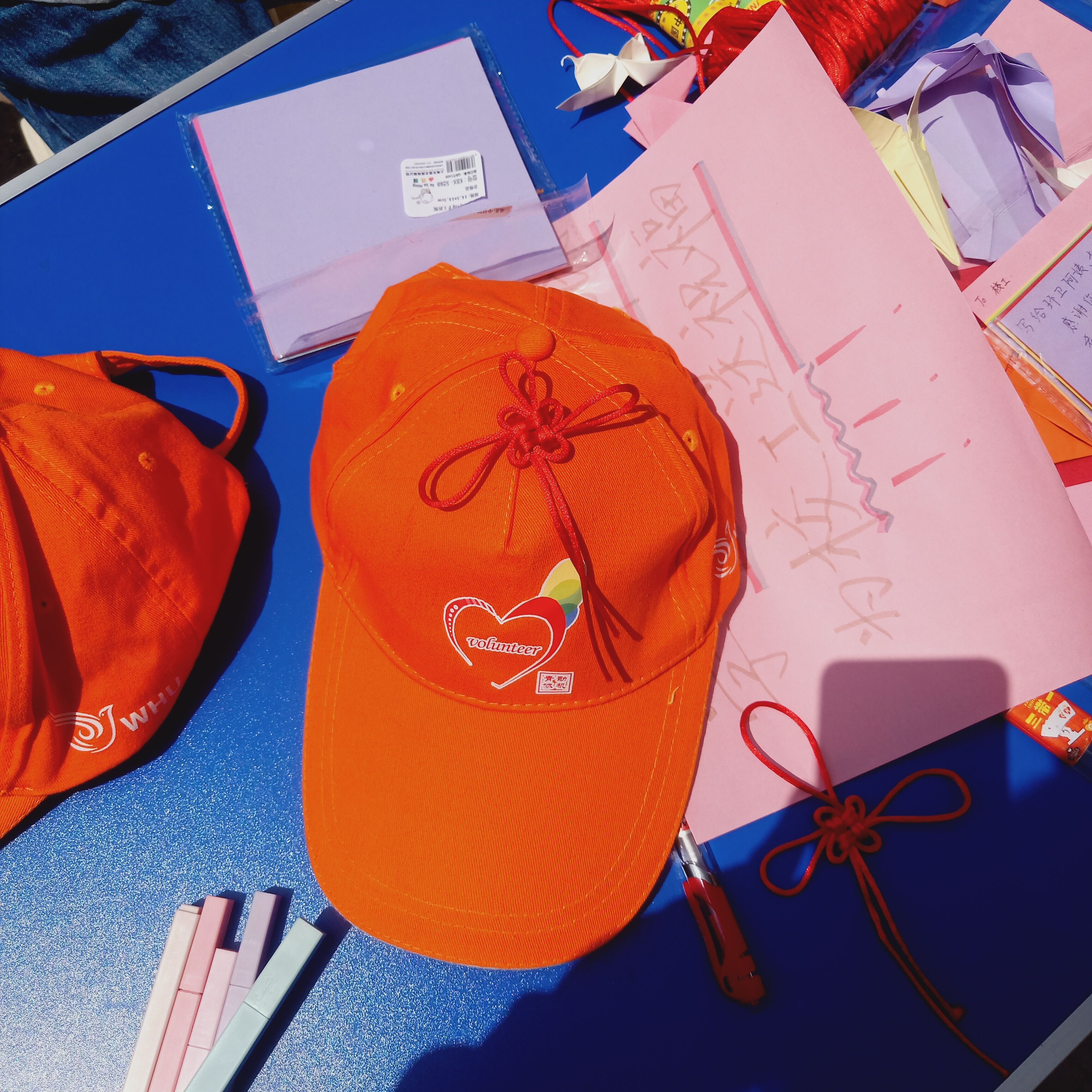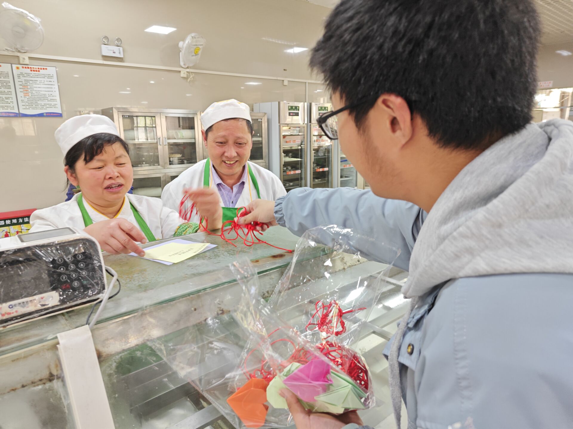 伴随着清晨的明媚阳光,在摆放好小桌子和材料后,志愿者们开始了自己的工作,他们手把手地教同学们编织平安结,引导同学们自由发挥创意进行折纸或剪纸,并在彩色纸条写下自己对默默无闻服务我们的校工衷心的祝福与感谢。
