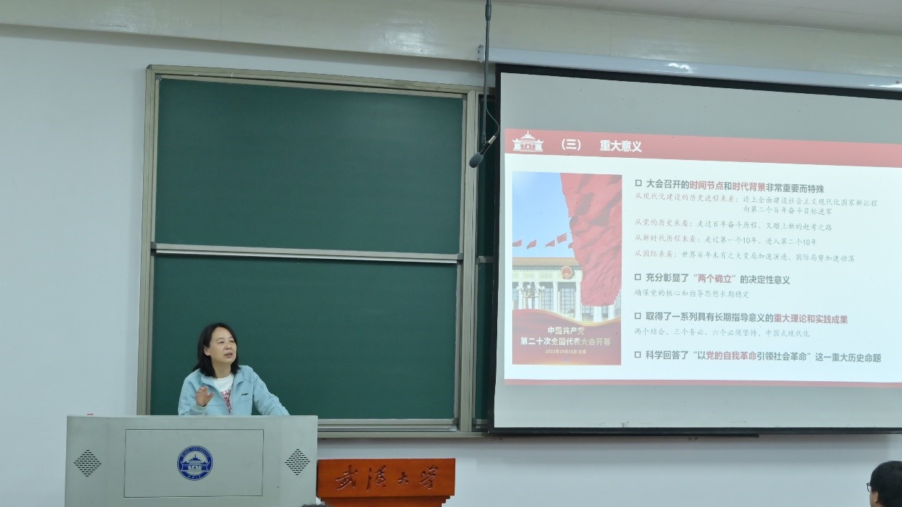 第二部分是本次党课的重点——深刻领会党的二十大的精神实质。报告起草具有党中央高度重视、同调查研究工作紧密结合、贯穿民主精神、充分听取各方面意见等特点,报告共计15个部分。孙萍书记将报告分为导语、党和国家各方面事业部署、结束语三个板块进行讲解。