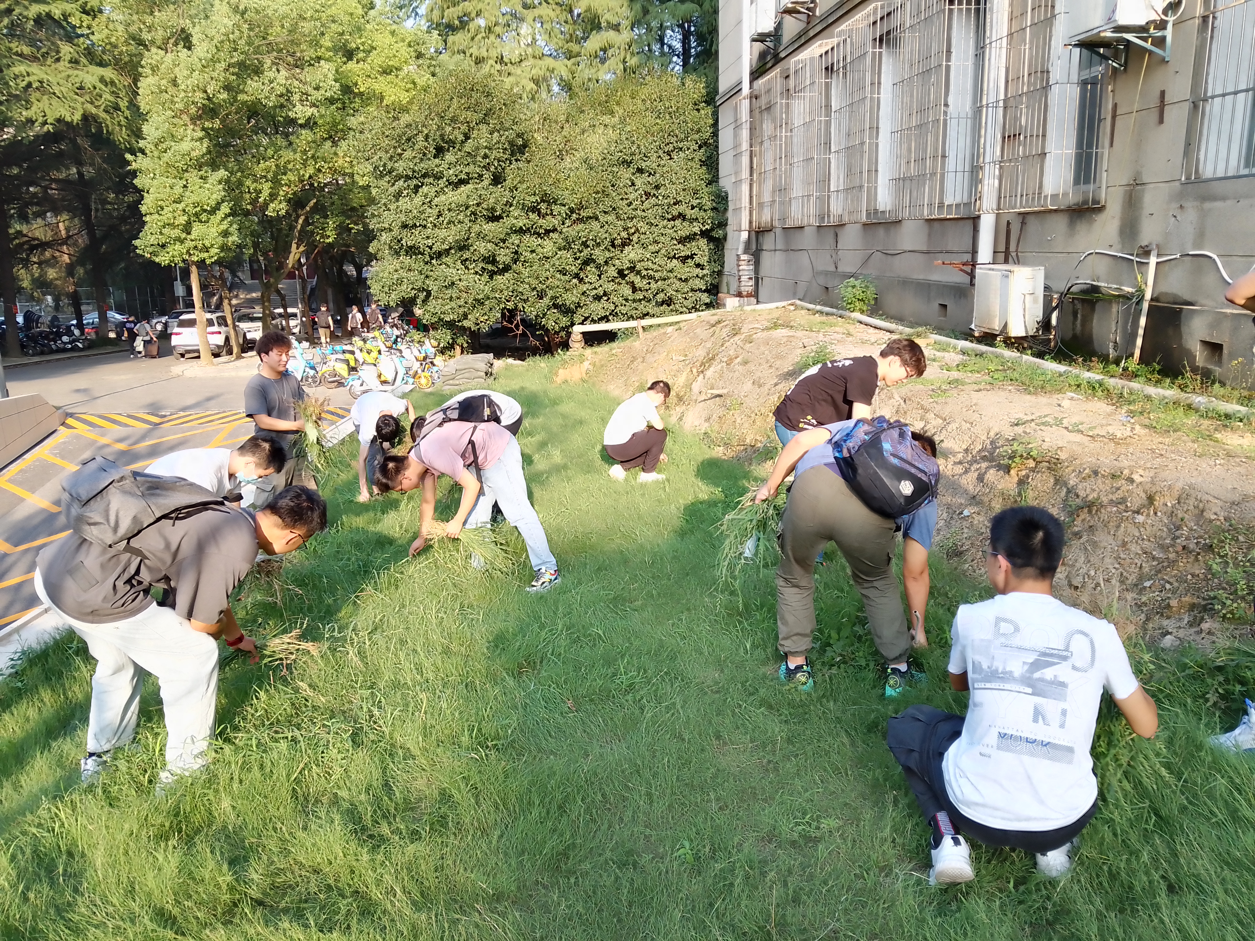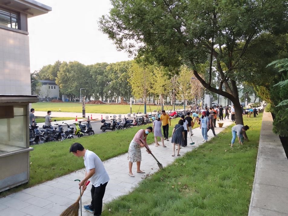 “老师们,同学们,就让我们开动起来,享受这个一起劳动的机会吧!”在汪思明书记简单的宣布活动开始后,每个党支部被带到预先划定的区域开始了义务劳动。下午五点的武汉是最美丽的,阳光撒在九教前面的绿色草坪上,十分温柔地抚慰着每一寸土地。美中不足的是,由于长久的施工,这片绿油油的草坪上有了一些杂草和垃圾。今天老师和同学们的任务就是打理这几片草坪,顺便打扫周边路上的施工垃圾。