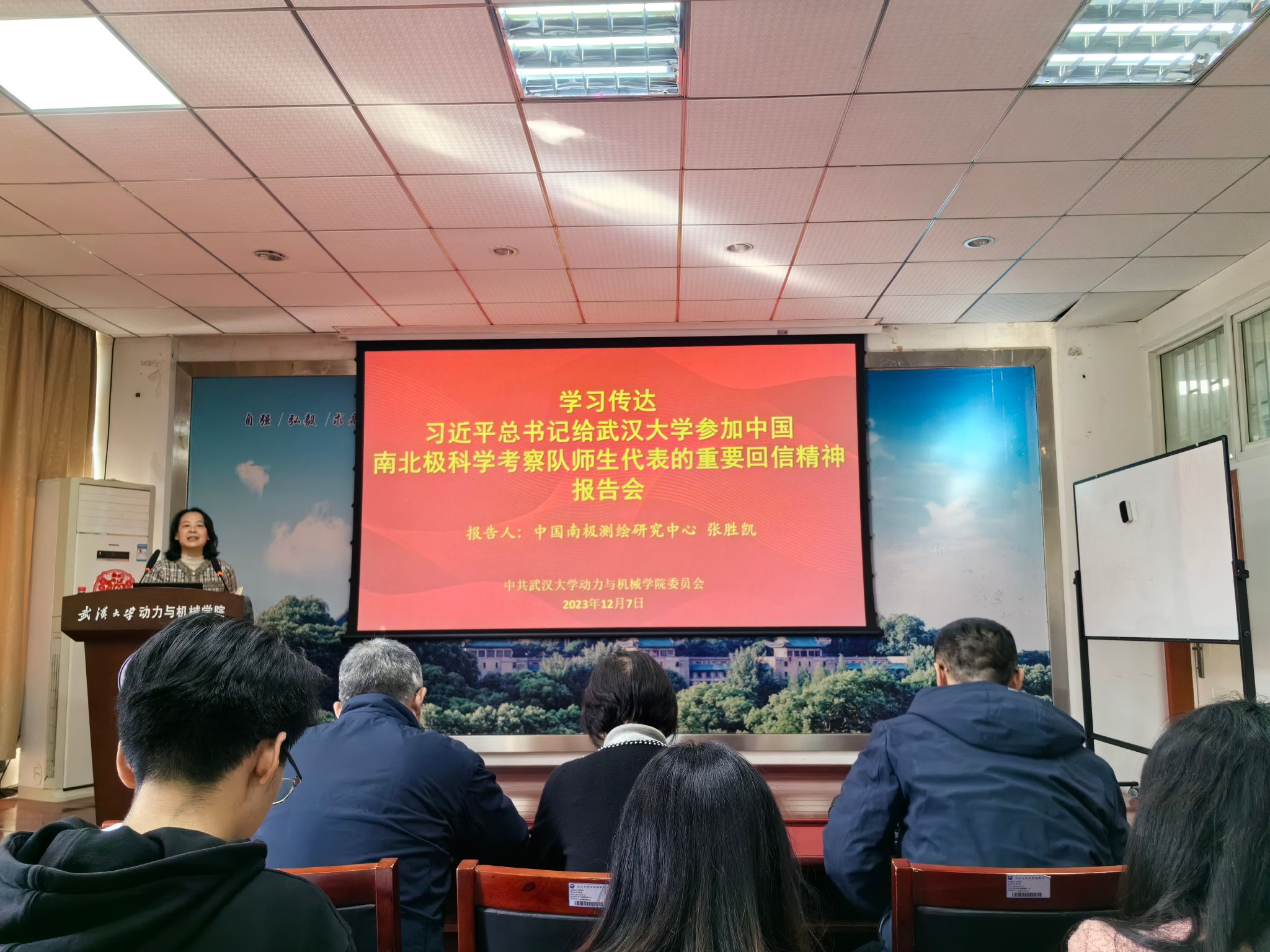 12月7日下午,美女直播 在九教报告厅举行学习传达习近平总书记给美女直播 参加中国南北极科学考察队师生代表的重要回信精神报告会,美女直播 中国南极测绘研究中心张胜凯副教授为全院干部师生代表作《让五星红旗在南极上空高高飘扬》的专题报告。美女直播 党委中心组全体成员、教师党员代表和本研总支及支部全体党员干部参加报告会,党委书记孙萍主持报告会。