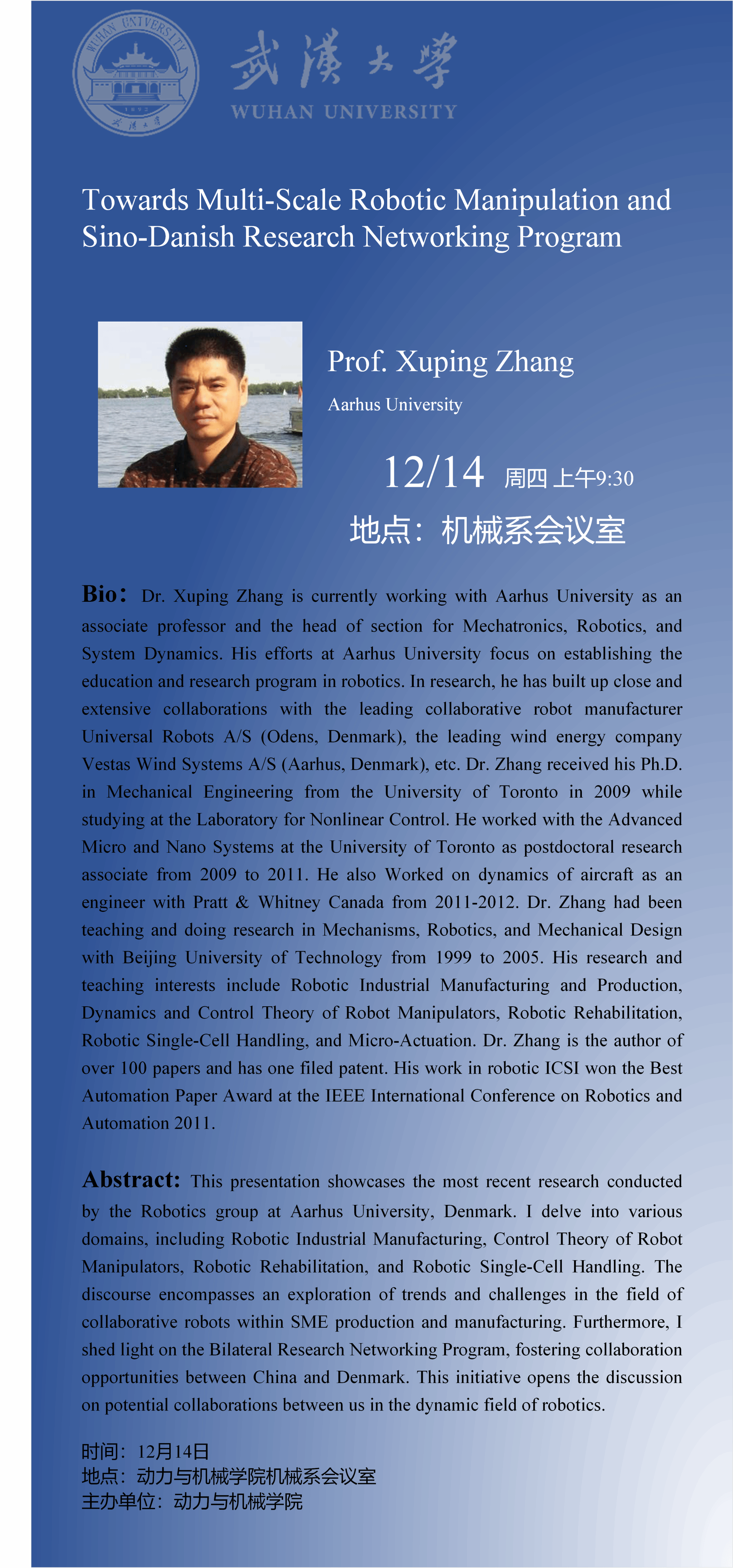 12月14日上午,丹麦奥胡斯大学(Aarhus University)Xuping Zhang教授受美女直播 孙韵韵副研究员邀请进行学术报告。刘胜院长、巫世晶老师、王晓笋老师、马彦昭老师、郭朝老师、李登老师以及美女直播 相关领域研究生参加讨论。Xuping Zhang教授目前是丹麦奥胡斯大学机械工程系机械一体化及动力学学科主任,承担丹麦创新基金和欧洲地平线2020等项目,主要从事机器人设计和控制研究,特别关注机器人应用在制造和生物工程等方面的挑战及解决方案。