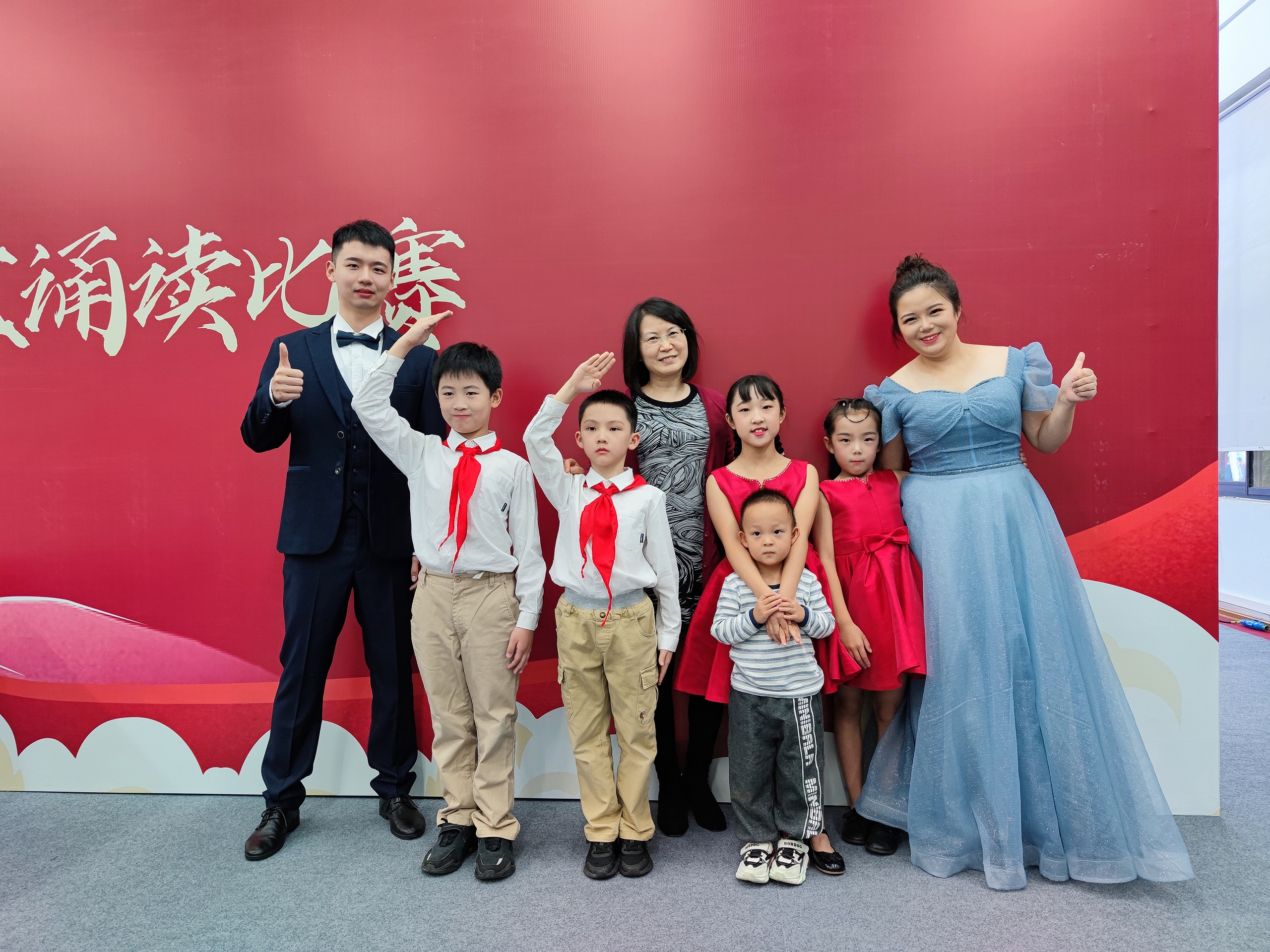本网讯(通讯员:刘泽庭 审核:李琦、孙林歌)10月31日,美女直播 教职工“颂百年风华•传红色基因”书香飘万家诵读比赛隆重举行。美女直播 由黄佳倩子、刘泽庭两位老师和定芸瑶、周辰睿、夏寰宇、黄传裕四位教职工子女深情演绎的配乐朗诵《盛世中国》获得现场评委及观众的高度肯定与热烈掌声,最终获得大赛优胜奖。