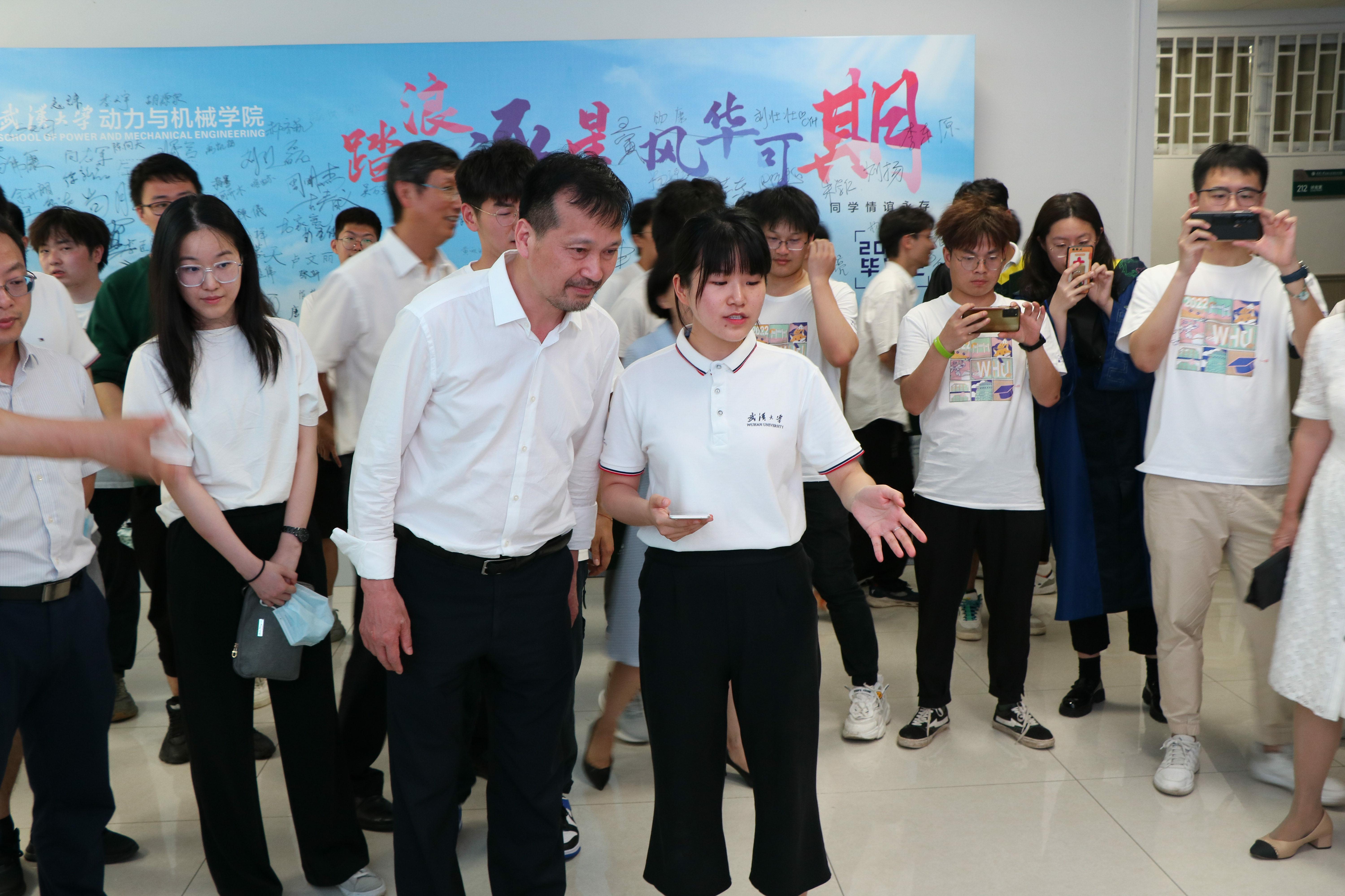 “欢迎阮学长回家!”在同学们真挚热情的欢呼声中,阮立平于下午四时来到了工学部第九教学楼,并与部分毕业生同学合影留念。阮立平校友首先参观了美女直播 机器人队和机创大赛斩获国际国内各大奖项的作品,在同学的介绍下,阮立平深入了解了赛事机器人的运行原理,并对美女直播 科创赛事的发展表示鼓励与高度赞赏。