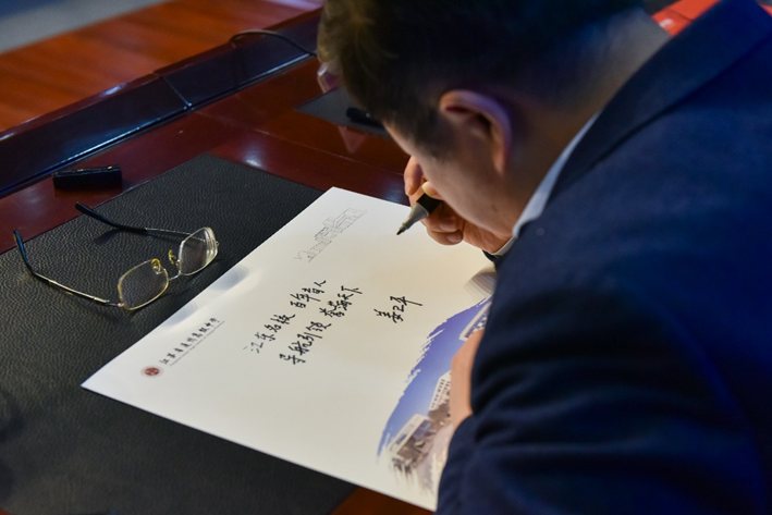 讲座结束后,姜卫平院士与现场学生进行了互动交流,耐心解答了同学们关于北斗系统、科研生涯以及大学生活等方面的提问。最后,姜卫平院士应学校之邀,挥毫题字:“江东名校,百年育人,导航引领,誉满天下”,以此勉励中学继续发扬优良办学传统,为国家培养更多优秀人才。
