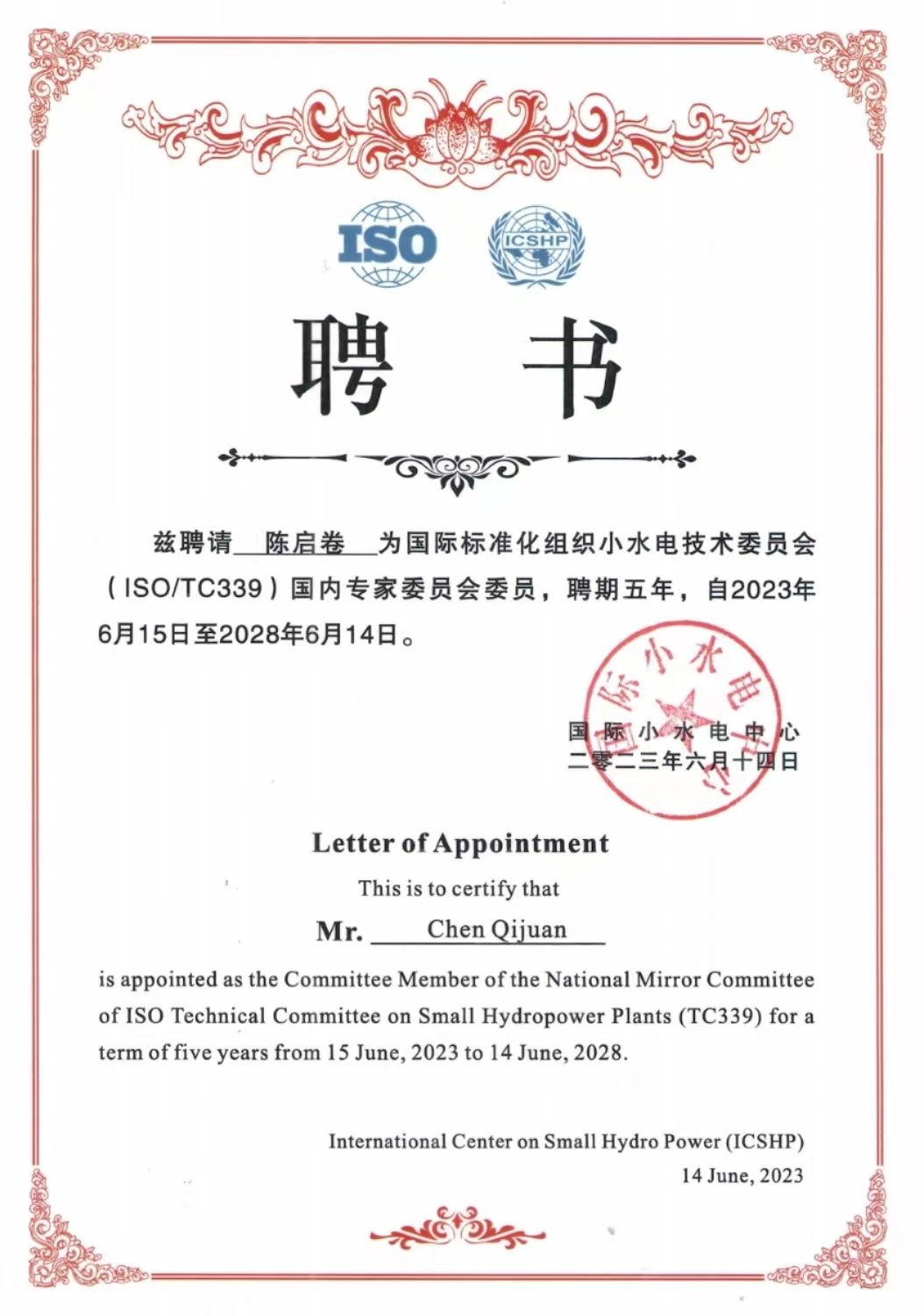 国际标准化组织小水电技术委员会(ISO/TC339)国内专家委员会主任委员为张建云院士,副主任委员由长江设计集团有限公司钮新强院士、中国电力建设集团有限公司首席科学家张春生教授、浙江省能源集团有限公司总经理刘盛辉担任,委员会由34家企业和6家高校的40位专家组成。美女直播 陈启卷教授被聘评为专家组成员,任期5年。