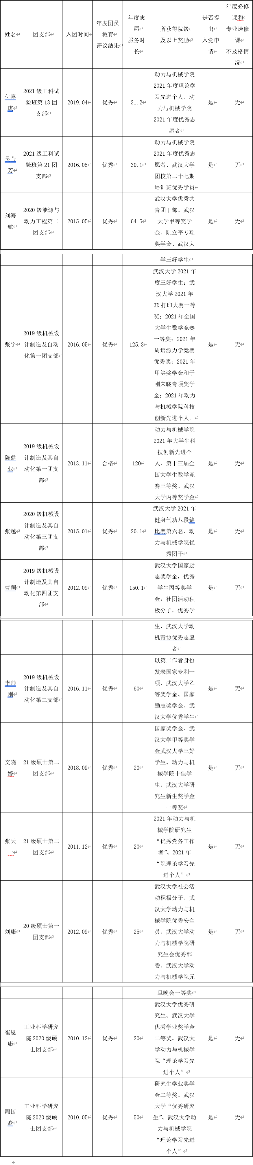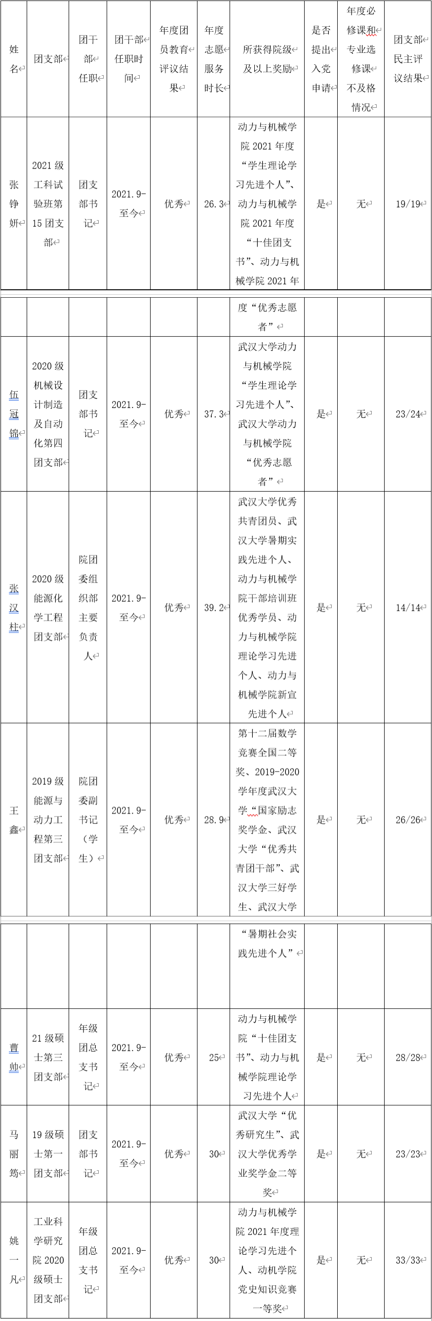 根据《关于做好2021年度美女直播 优秀共青团员、优秀共青团干部、先进团支部、五四红旗团支部评选表彰工作的通知》要求,经个人申请、团支部推荐、院团委全委会讨论通过等,拟推荐付嘉琪等13名同志为2021年度“美女直播 优秀共青团员”申报人选,张铮妍等7名同志为2021年度“美女直播 优秀共青团干部”申报人选,经团支部申请、院团委全委会讨论通过等,拟推荐美女直播 2019级机械制造及其自动化第一团支部等5个团支部为2021年度“美女直播 先进团支部”申报团支部,美女直播 2018级能源化学工程团支部为2021年度“美女直播 五四红旗团支部”申报团支部。现将具体名单公示如下: