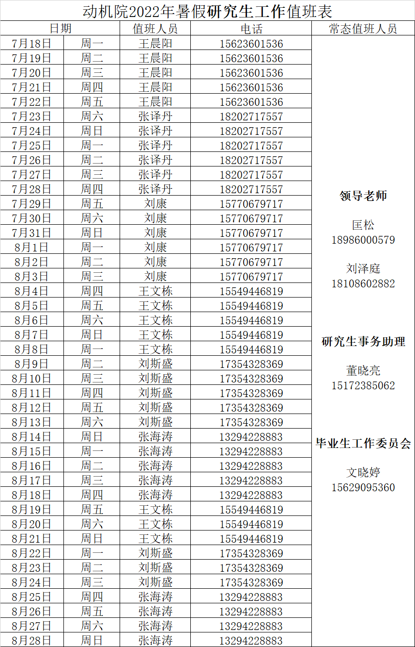 2022暑期研究生工作值班安排