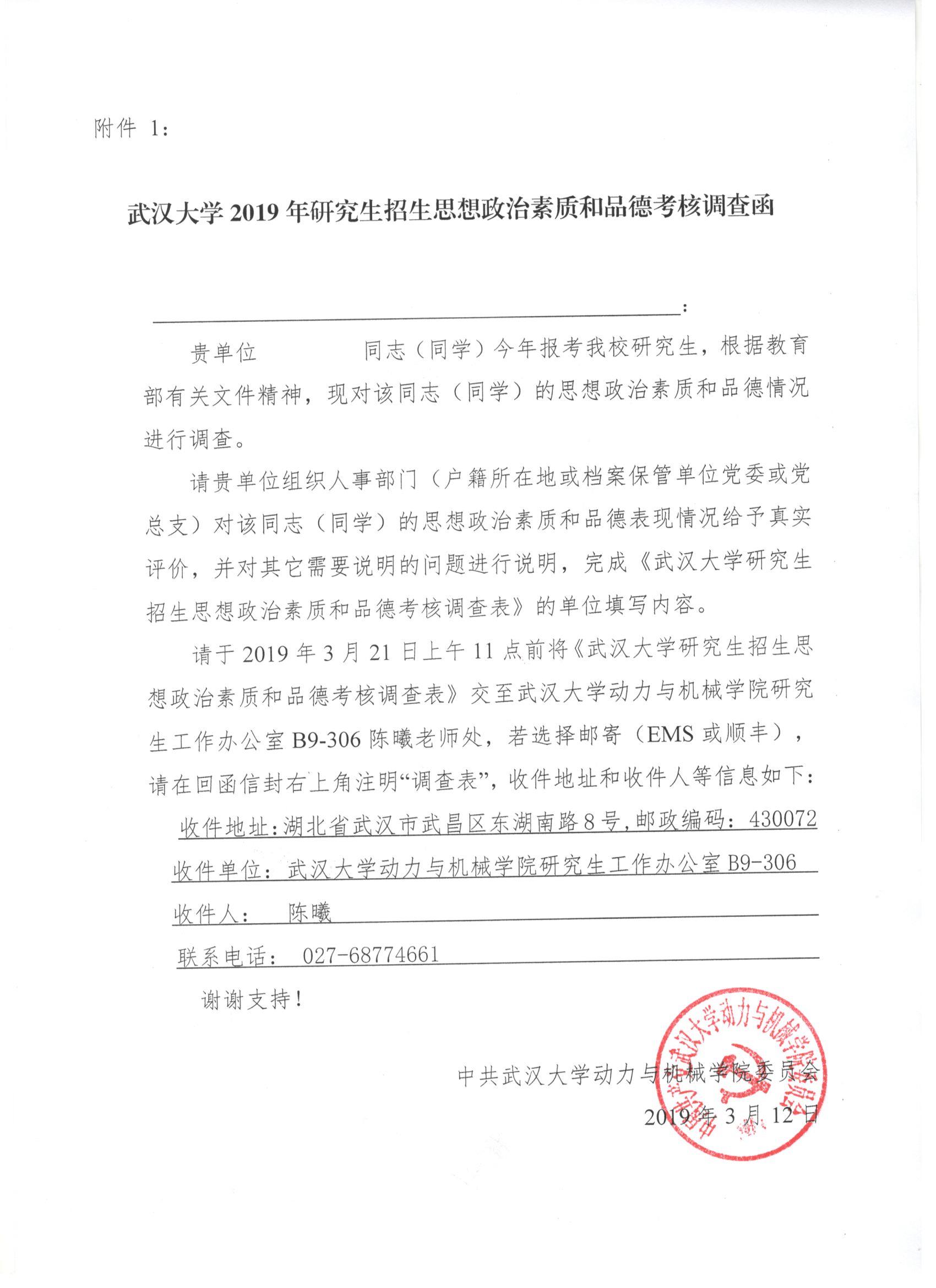 请考生及时下载《美女直播 2019年研究生招生思想政治素质和品德考核调查函》(以下简称:调查函,见附件1)和《美女直播 研究生招生思想政治素质和品德考核调查表》(以下简称:调查表,见附件2),其中调查函请彩打,调查函和调查表请认真手写填写完整自己的信息(调查函第一行写自己目前所在单位,第二行空白处写自己的姓名)后,将两个表格一并交给本单位相关负责人,请求其完成考生调查表中单位填写的部分,并于参加复试前(3月21号上午11点前),提交或邮寄调查表(注意:美女直播 不需要调查函,因为调查函是让考生给帮你写调查表的老师看的)至美女直播 学生工作办公室(B9306)陈曦老师处。