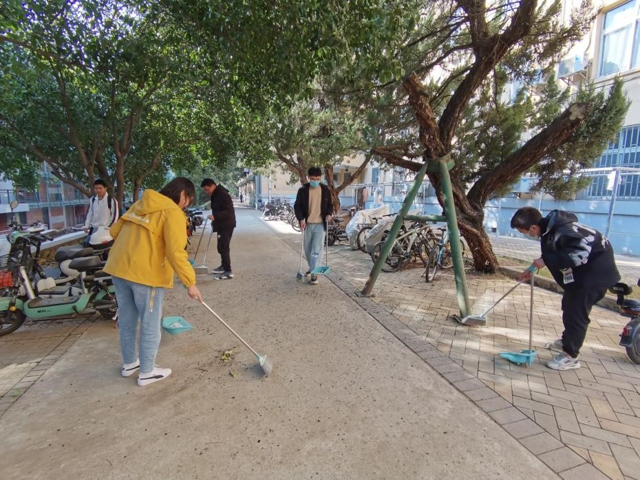 (志愿者在清理九教、学生宿舍及附近街道)