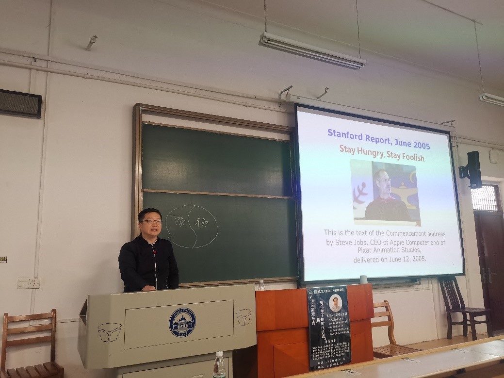 胡雪蛟教授在讲座的开始和结尾两次提到了乔布斯的名言:"Stay hungry, Stay Foolish”,并引用北宋儒学家张载的“为天地立心,为往圣继绝学;为生民立命,为万世开太平”作为中文解读,最后寄语21级新生,“要牢记自己为什么而读书”,对动机院学子表现出殷切期盼。