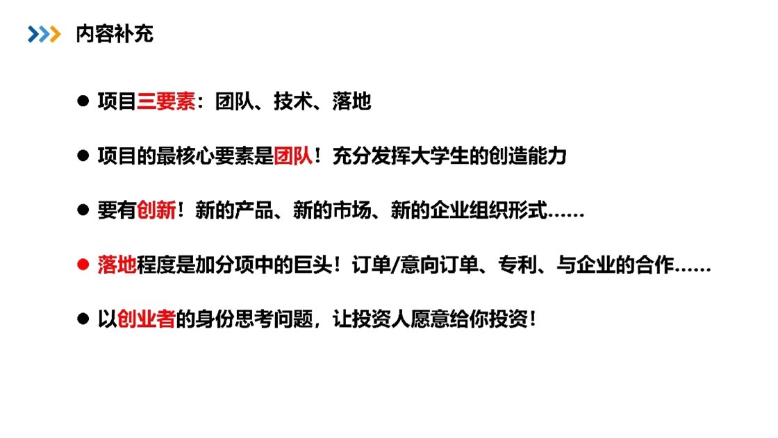 活动第四项,由院团委书记黄佳倩子老师就本次动员会做总结讲话。黄佳老师从比赛奖励、两类大赛的区别、参赛项目的关键点以及时间节点四个方面对大赛做了补充说明,强调了学校美女直播 对参赛项目的大力支持,肯定了美女直播 去年取得的成绩,同时也对今年参赛的同学们表达了殷切期望。