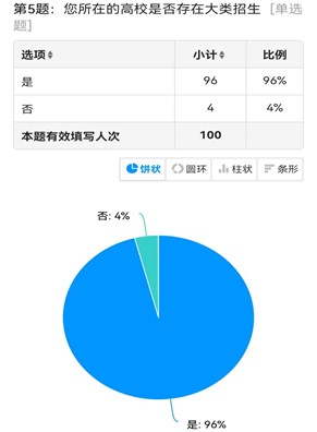 根据采访以及统计出的结果,“大类招生”模式已经普及至极大多数高校。受访者们认为:“大类招生”这一新型人才培养模式在政策的支持下保持着平稳的发展节奏,不仅给学生提供了更高的选择性、有助于学生们在认识专业、了解专业后做出更成熟的选择,也利于一些不为人了解的所谓“冷门专业”将其真正面貌展现出来从而吸收更多人才。但在其许多的优势与带来的便利之外仍然存在着一些亟需解决的问题。按流程分为招生环节、学期中的学习环节、分流环节等环节中的问题,如下所述。
