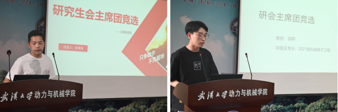 参与此次美女直播 主席团成员增补竞选的候选人有2021级机械电子工程专业硕士生邬邦、2021级流体机械及工程专业硕士生张海涛。他们依次上台进行演讲,展示了自己的竞争优势和对主席团工作的见解,总结了过去一年的工作经历,并对接下来的工作进行规划及创新。