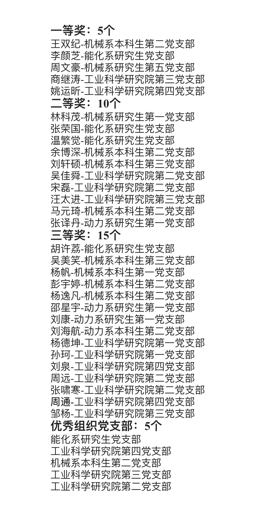 经过主题内容,语言表达、文章结构以及创新亮点四个方面评审,共评选出了5个一等奖,10个二等奖、15个三等奖和5个优秀组织党支部。