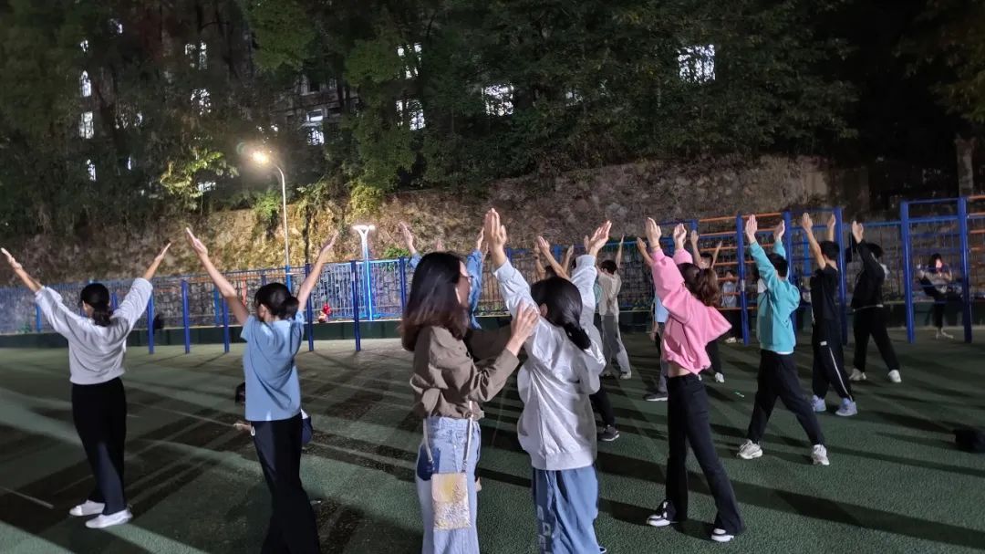 除了每晚坚持训练的队员,体育部负责人胡莹和领操员曾芮,恪尽职守地纠正队员的动作,提高队列的整齐度。