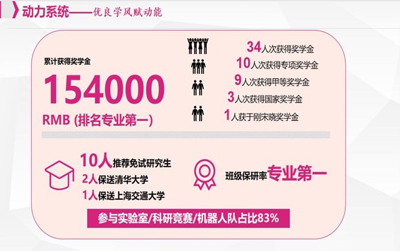 学风优良,成绩优异。全班累计34人次获得各类奖学金、3人次获得国家奖学金、1人获得于刚宋晓奖学金,总金额超过15万元,10人获得推免资格,2人保送清华大学,1人保送上海交通大学,班级保研率专业第一。