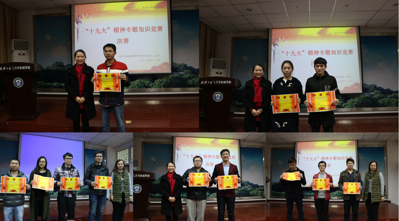 决赛结束后,进行“学习十九大精神主题知识竞赛”的颁奖仪式。机械系研究生第一党支部和机械系研究生第二党支部获得优秀组织奖,王天平获得一等奖,龚志顺和徐炼获得二等奖,郭欣然、李明阳和韩宇获得三等奖,赵灯、赵悦、荣智辉和袁伟星获得优秀奖,冀文恒、刘泽锋、徐东方、焦博、谢裕畴、梁少军、相贝贝、刘权、范德良和黄一冲获得优胜奖。