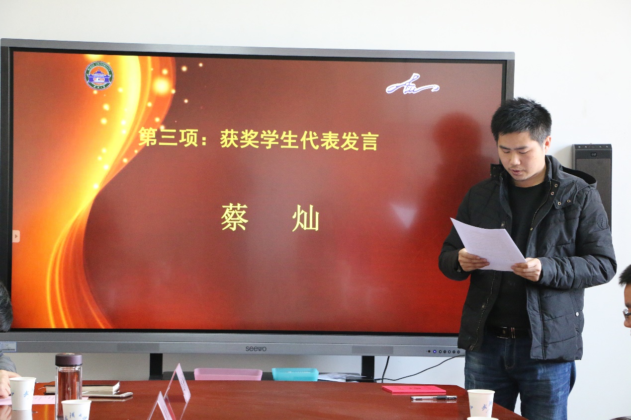 颁奖完毕后,获奖学生代表蔡灿做了热情洋溢的发言。他代表全体获奖学生,衷心感谢沈阳奥拓福科技股份有限公司和武子全董事长的无私捐助。这次获奖是对他以及其他研究生所做出的努力的极大肯定,坚定了大家继续从事水射流技术研究的决心与信心。“奥拓福水射流奖学金”给予的不仅是物质上的资助,更重要的是对在水射流领域中的研究生们辛勤付出与获得的成就的激励。他倡议全体获奖者在往后的研究中再接再厉、锲而不舍,推动水射流技术的发展更上一层楼!