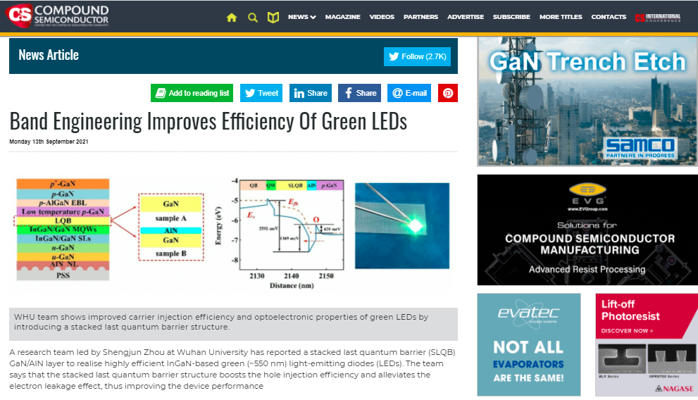 由于InGaN基LED具有可调发射光谱,对红、绿、蓝三色LED色彩混合是实现全彩Micro-LED显示的有效途径。为解决InGaN基绿光LED芯片外量子效率较低的问题,周圣军教授研究小组运用能带工程技术,重点研究了堆叠式GaN/AlN量子势垒对InGaN基绿光LED光电性能的影响。结果表明,在AlN/p-GaN界面产生的极化诱导面电荷可以加速空穴,并且GaN/AlN中的AlN层可以实现空穴的带内隧穿从而有利于空穴注入到有源区,同时也提高了电子的有效势垒高度。由于提高了空穴注入效率和抑制了电子泄漏,采用此结构的绿光LED发光效率得到显著提高,研究结果以《Stacked GaN/AlN last quantum barrier for high-efficiency InGaN-based green light-emitting diodes》为题发表在国际权威期刊《Optics Letters》。论文共同第一作者为陶国裔和赵晓宇,论文通讯作者为周圣军教授,美女直播 为论文第一作者和通讯作者单位。(原文链接://www.osapublishing.org/ol/fulltext.cfm?uri=ol-46-18-4593&id=458586)