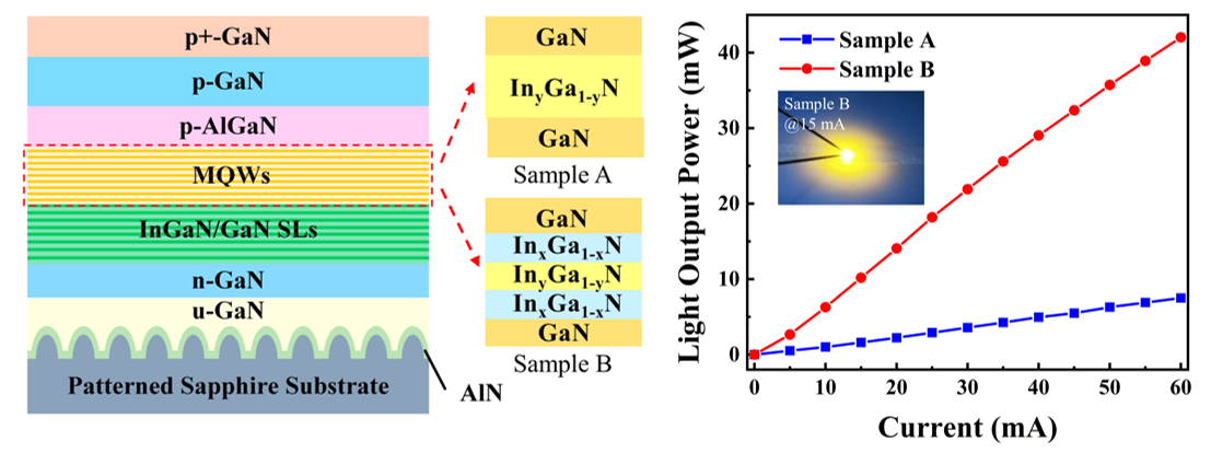 III族氮化物LED以其低能耗、长寿命和体积小等优点,逐渐成为传统光源的重要替代。一般来说,InGaN量子阱中铟(In)含量越高,LED发光波长越长。然而,随着铟组分的增加,InGaN量子阱面内压应力升高,会产生较强的极化场,导致InGaN基黄光LED量子效率仍然比蓝光LED低很多。周圣军教授研究小组扩展了能带工程在长波段LED中的应用,并分析了阶梯形量子阱对器件光电性能和晶体质量的影响。与方形量子阱 LED相比,具有阶梯形量子阱的黄光(〜570 nm)LED表现出更高的光输出功率及更优的晶体质量,研究结果以《Rational construction of staggered InGaN quantum wells for efficient yellow light-emitting diodes》为题发表在国际权威期刊《Applied Physics Letters》。论文第一作者为美女直播 博士生赵晓宇,论文通讯作者为周圣军教授,美女直播 为论文第一作者和通讯作者单位。(原文链接://aip.scitation.org/doi/10.1063/5.0043240)