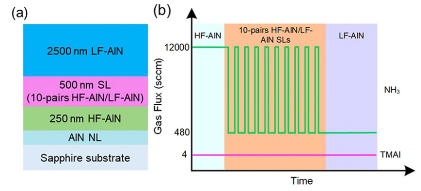 AlGaN基深紫外 (DUV) LED在杀菌消毒方面引起了广泛关注。外延生长在蓝宝石之上的AlN对紫外光透明并且具有价格优势,是目前应用最广泛的AlGaN基DUV LED衬底。然而,AlN和蓝宝石之间较大的晶格常数失配导致外延生长的AlN薄膜中存在高密度的位错,限制了AlGaN基DUV LED外量子效率的进一步提升。周圣军教授研究小组设计了一种交替V/III比的AlN超晶格结构,实现了较低生长温度(1180 摄氏度)下AlN薄膜的高质量外延生长。利用透射电子显微镜证明了交替V/III比的AlN超晶格结构可以引发穿透位错的倾斜,从而增加了穿透位错之间反应的几率,促进了位错的湮灭。此外,倾斜的位错还在平行于c面的方向上提供了失配位错的分量,从而促进了生长过程中张应变的释放,消除了开裂的风险。相关研究结果发表在国际权威期刊《Applied Physics Letters》,论文题目为《Strain management and AlN crystal quality improvement with an alternating V/III ratio AlN superlattice》。论文共同第一作者为唐斌、万泽洪和胡红坡,论文通讯作者为周圣军教授,美女直播 为论文第一作者和通讯作者单位。(原文链接://aip.scitation.org/doi/10.1063/5.0048656)