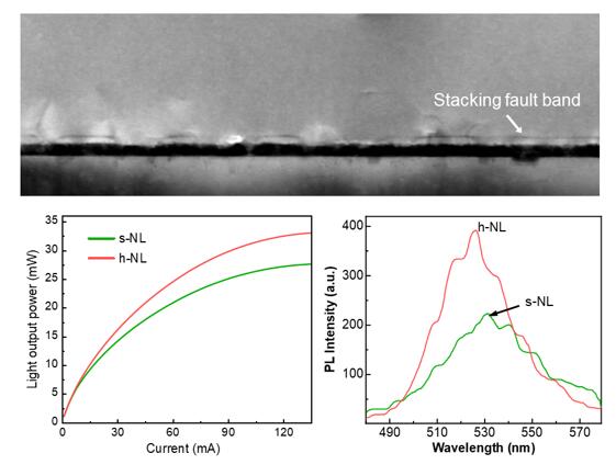 为进一步提高绿光LED效率,周圣军教授研究小组开发了由溅射AlN和中温GaN组成的复合成核层。在复合成核层之上继续外延生长GaN时,由于减小了GaN与蓝宝石之间的晶格常数适配,GaN倾向于横向生长,因此在GaN外延层中形成了层错结构。层错结构的产生有效的促进了应力的释放,减少了穿透位错的密度。此外,结合变温荧光光谱和时间分辨荧光光谱实验证明了生长在复合成核层之上的InGaN/GaN多量子阱中形成了更深的局域态,因此进一步提高了InGaN/GaN绿光LED的内量子效率。研究结果以《Toward efficient long-wavelength III-nitride emitters using a hybrid nucleation layer》为题发表在国际权威期刊《Optics Express》。论文共同第一作者为唐斌、宫丽艳和胡红坡,论文通讯作者为周圣军教授,美女直播 为论文第一作者和通讯作者单位。(原文链接://www.osapublishing.org/oe/fulltext.cfm?uri=oe-29-17-27404&id=456075)