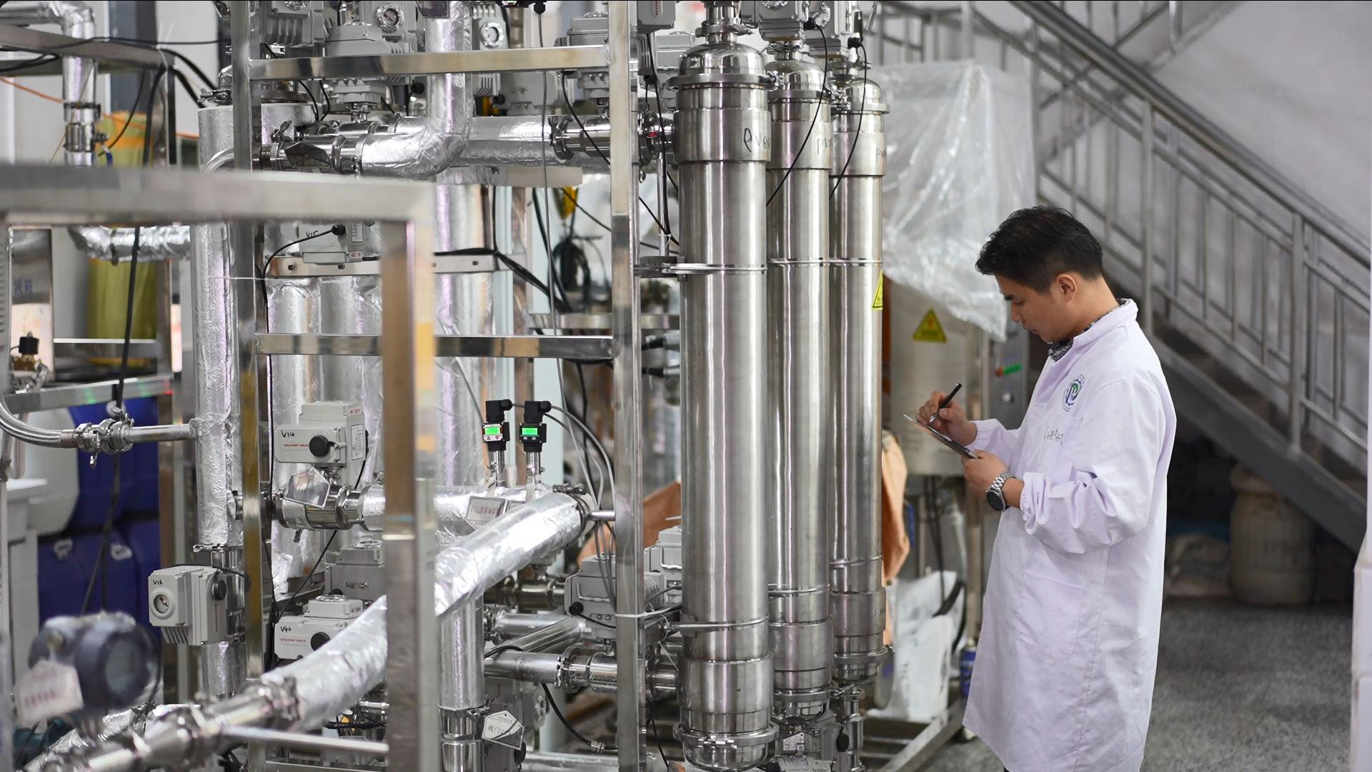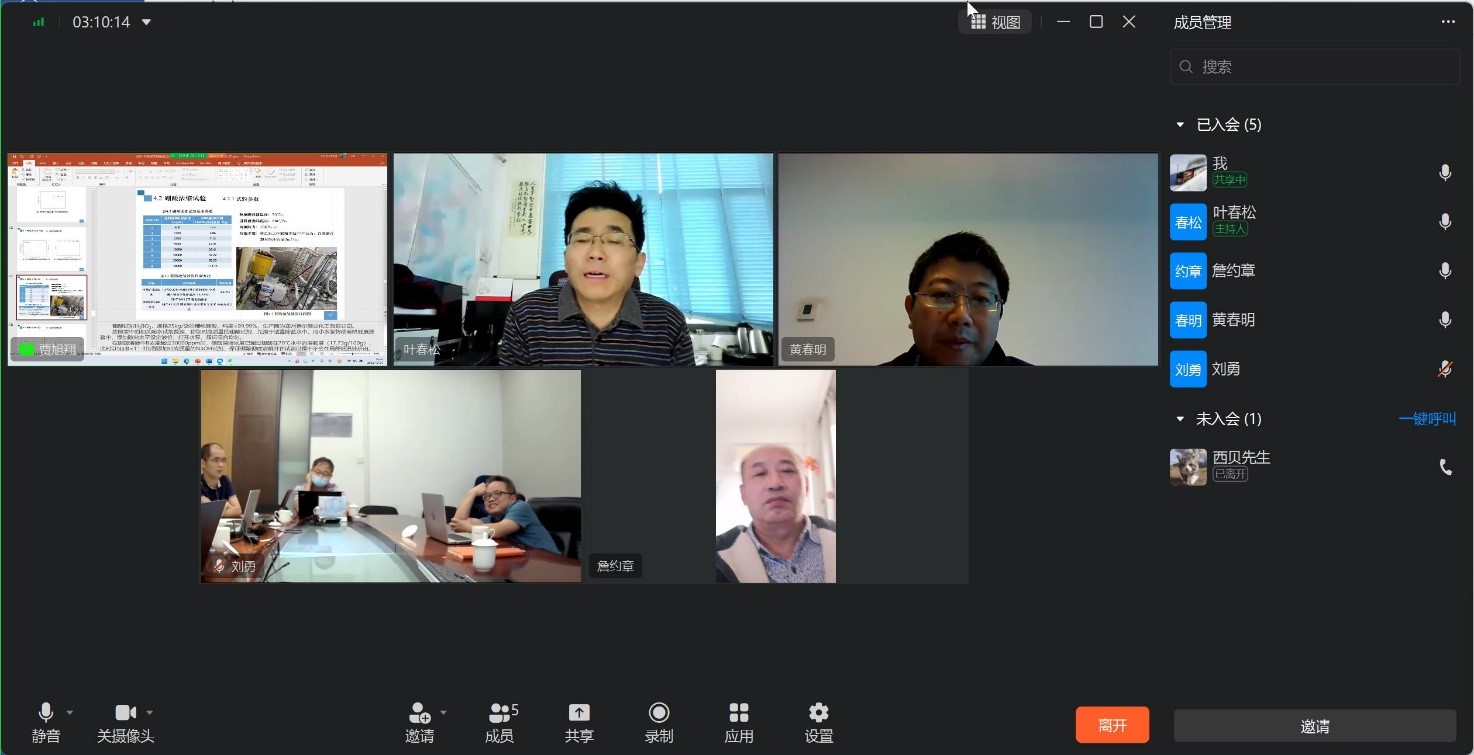博士研究生贾旭翔同学向专家组汇报了膜材料耐辐照性能测试、疏水膜组件设计、模块化中试装置设计、检测与控制系统设计、关键性能试验、辐射防护罩设计与安装等系列研究成果。专家组审阅了相关资料,质询了有关科学技术问题,经过讨论分析,认为课题组圆满完成了项目合同任务;膜蒸馏温度极化三维流变物理模型构建、数学模型计算及虚拟仿真等理论成果,具有重要指导意义;模块化中试装置及其检测控制系统,可用于现场实际辐射性废水中试试验。该项目自主研制的模块化放射性废水膜蒸馏中试装置,单支膜元件循环处理热侧废水流量为5m³/h,三支膜元件可自由组合操作,是目前国际上核电站放射性废水膜蒸馏处理试验研究项目中容量最大的中试设备。