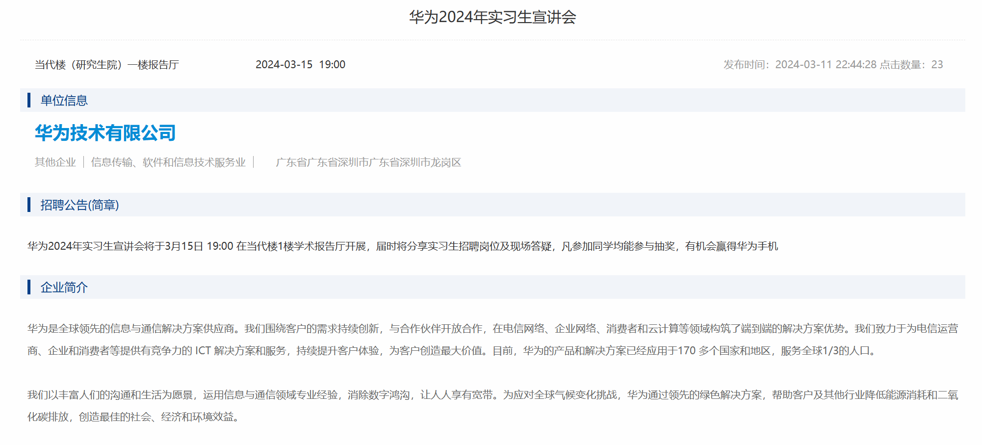 华为2024年实习生宣讲会将于3月15日 19:00 在当代楼1楼学术报告厅开展,届时将分享实习生招聘岗位及现场答疑。