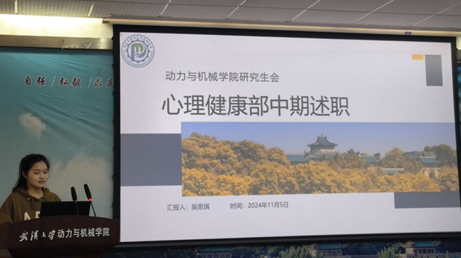 心理健康部负责人吴思琪同学介绍了部门情况并展示了近期完成的一系列活动,包括“心影共鸣”流浪拍立得计划、“致敬时光”新生慢递活动、交换空间”宿舍文化资助项目和“秋日暖阳”手作奶茶体验营等美女直播 第七届研究生“心理健康节”重点项目,以及谈心谈话、心理健康讲座等工作。这些不仅缓解了同学们科研学习压力,促进了身心健康发展,同时也为校院“三全育人”贡献了一份力量。