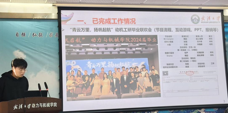 文体部负责人李瑞颉同学详细介绍了过去一段时间部门完成的研究生集体舞大赛、“新工科杯”体育文化节、师生趣味运动会等活动。上述活动不仅为大家提供了展现文艺体育风采的平台,还增强大家的身体素质,更提升了班级凝聚力和师生互动水平。最后,负责人也结合日常工作的思考,对文体部过去的工作内容做出了反思,并对研会的发展提出了相关建议。