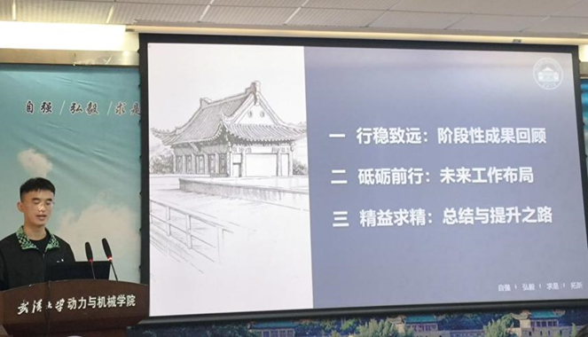 院研究生会主席团成员史展天以“传承、融汇、创新”为框架汇报了他在过去一段时间完成的工作,介绍了后续工作计划,并指出研究生会骨干应当不断提高思想引领的水平和服务同学的能力,努力打造让同学们想得起、找得到、靠得住的优秀学生组织。